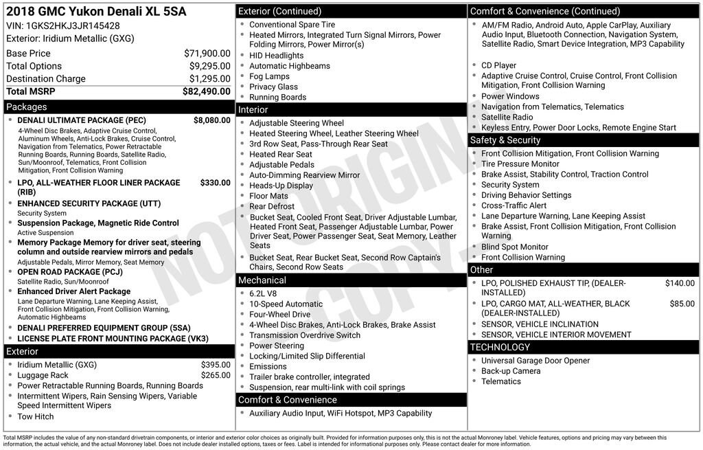 2018 GMC Yukon XL Denali Iridium Metallic 4WD EcoTec3 6.2L V8 10-Speed Automatic with Overdrive4WD.Odometer is 42972 miles below market average!Visit www.johnsonautoplaza.com for more information. Feel free to browse our inventory online, request more information about vehicles, set up a test drive or inquire about financing.We look forward to serving you! Adaptive Cruise Control w/Forward Automatic Braking (4-Wheel Disc & 4-Wheel VAC Power Antilock Brakes and Forward Automatic Braking), All-Weather Floor Liner Package (LPO), Denali Ultimate Package (Pwr Retractable Assist Steps w/Perimeter Lighting and Wheels: 22 x 8.5 Ultra-Bright Aluminum), Enhanced Driver Alert Package (Forward Collision Alert, IntelliBeam Automatic High Beam On/Off Headlamps, Lane Keep Assist w/Lane Departure Warning, and Low Speed Forward Automatic Braking), Enhanced Security Package (Theft-Deterrent Alarm System, Vehicle Inclination Sensor, and Vehicle Interior Movement Sensor), License Plate Front Mounting Package, Magnetic Ride Control Suspension Package, Memory Package, Open Road Package (3rd Row DVD Screen, Power Tilt-Sliding Sunroof w/Express-Open/Close, and Rear Seat Blu-Ray/DVD Entertainment System), Preferred Equipment Group 5SA (4-Wheel Antilock Disc Brakes, 5 Auxiliary 12-volt Power Outlets, Black Assist Steps w/Chrome Strip, Hands Free Power Liftgate, Heated Leather-Wrapped Steering Wheel, Inside Rear-View Auto-Dimming Mirror, Integrated Trailer Brake Controller, Lane Change Alert w/Side Blind Zone Alert, OnStar 4G LTE, OnStar Basic Plan For 5 Years, Passive Entry System, Power Release Second Row Bucket Seats, Power Tilt & Telescopic Steering Column, Power-Adjustable Pedals For Accelerator & Brake, Push Button Keyless Start, Rear Cross-Traffic Alert, Remote Keyless Entry, Universal Home Remote, and Wireless Charging), 4WD, 10 Speakers, 3.23 Rear Axle Ratio, 3rd row seats: split-bench, 4-Wheel Disc Brakes, ABS brakes, Adaptive suspension, Adjustable pedals, Air Conditioning, Alloy wheels, AM/FM radio: SiriusXM, Apple CarPlay/Android Auto, Auto High-beam Headlights, Auto-dimming door mirrors, Auto-dimming Rear-View mirror, Automatic temperature control, Black All-Weather Cargo Mat (LPO), Black Roof Rack Cross Rails, Bodyside moldings, Bose Centerpoint Premium 10-Speaker Surround Sound, Brake assist, Bumpers: body-color, CD Player, CD player, Compass, Delay-off headlights, Driver door bin, Driver vanity mirror, Dual front impact airbags, Dual front side impact airbags, Electronic Stability Control, Emergency communication system: OnStar and GMC connected services capable, Exterior Parking Camera Rear, Front anti-roll bar, Front Bucket Seats, Front Center Armrest, Front dual zone A/C, Front fog lights, Front reading lights, Front wheel independent suspension, Full-Feature Reclining Bucket Seats, Fully automatic headlights, Garage door transmitter: HomeLink, Genuine wood console insert, Genuine wood dashboard insert, Genuine wood door panel insert, Heads-Up Display, Heated & Ventilated Driver & Front Passenger Seats, Heated door mirrors, Heated front seats, Heated rear seats, Heated steering wheel, High-Intensity Discharge Headlights, Illuminated entry, Leather Shift Knob, Low tire pressure warning, Memory seat, Navigation System, Occupant sensing airbag, Outside temperature display, Overhead airbag, Overhead console, Panic alarm, Passenger door bin, Passenger vanity mirror, Pedal memory, Perforated Leather-Appointed Seat Trim, Polished Exhaust Tip, Power door mirrors, Power driver seat, Power Liftgate, Power passenger seat, Power steering, Power windows, Premium audio system: IntelliLink, Radio: AM/FM/SiriusXM w/Navigation, Rain sensing wipers, Rear air conditioning, Rear anti-roll bar, Rear reading lights, Rear window defroster, Rear window wiper, Remote keyless entry, Roof rack: rails only, Security system, SiriusXM NavTraffic, SiriusXM Satellite Radio, Speed control, Speed-sensing steering, Split folding r