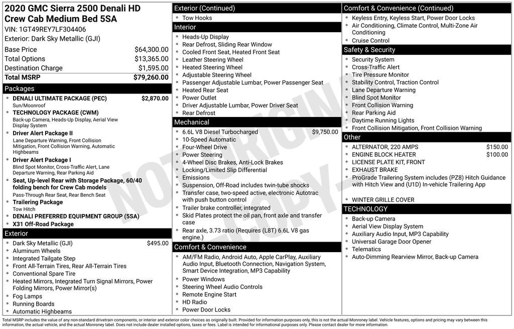 2020 GMC Sierra 2500HD Denali Dark Sky Metallic 4WD Duramax 6.6L V8 Turbodiesel 10-Speed Automatic10-Speed Automatic, 4WD, Jet Black Leather.Odometer is 19492 miles below market average!Visit www.johnsonautoplaza.com for more information. Feel free to browse our inventory online, request more information about vehicles, set up a test drive or inquire about financing.We look forward to serving you! Denali Ultimate Package (Power Sunroof), Driver Alert Package I (Lane Change Alert w/Side Blind Zone Alert, Rear Cross Traffic Alert, and Ultrasonic Front & Rear Park Assist), Driver Alert Package II (Automatic Emergency Braking, Following Distance Indicator, Forward Collision Alert, IntelliBeam Automatic High Beam On/Off, and Lane Departure Warning System), Preferred Equipment Group 5SA (12-Volt Rear Auxiliary Power Outlet, 120-Volt Bed Mounted Power Outlet, 120-Volt Instrument Panel Power Outlet, 2 USB Ports, 2 USB Ports (1st Row), 2-Speed Active Transfer Case, 2nd Row Dual USB Charge-Only Ports, 4G LTE Wi-Fi Hotspot Capable, 6 Rectangular Chromed Tubular Assist Steps, Chrome Recovery Hooks, Compass Located In Instrument Cluster, Deep-Tinted Glass, Electric Rear-Window Defogger, Electrical Lock Control Steering Column, Floor-Mounted Center Console, GMC Connected Access Capable, HD Rear Vision Camera, Heated & Ventilated Front Bucket Seats, Heated 2nd Row Outboard Seats, Heated Driver & Front Outboard Passenger Seats, Integrated Trailer Brake Controller, Keyless Open & Start, LED Cargo Area Lighting, LED Smoked Amber Roof Marker Lamps, Manual Tilt-Wheel/Telescoping Steering Column, OnStar & GMC Connected Services Capable, Polished Exhaust Tip, Power Door Locks, Power Front Passenger Windows w/Express Up/Down, Power Rear Windows w/Express Down, Power Sliding Rear Window w/Defogger, Power Windows w/Driver Express Up/Down, Rear Wheelhouse Liners, Remote Vehicle Starter System, Safety Alert Seat, Signature Denali Grille, Spray-On Pickup Box Bed Liner w/Denali Logo, Steering Wheel Audio Controls, Unauthorized Entry Theft-Deterrent System, Universal Home Remote, and Wireless Charging), Technology Package (Bed View Camera, HD Surround Vision w/2 Trailer View Camera Provisions, Multicolor 15 Diagonal Head-Up Display, and Rear Camera Mirror), X31 Off-Road Package (Hill Descent Control), 10-Speed Automatic, 4WD, Jet Black Leather, 10-Way Power Driver Seat Adjuster w/Lumbar, 10-Way Power Passenger Seat Adjuster w/Lumbar, 220 Amps Alternator, 4-Wheel Disc Brakes, 7 Speakers, ABS brakes, Air Conditioning, Alloy wheels, AM/FM radio: SiriusXM, Apple CarPlay/Android Auto, Auto High-beam Headlights, Auto-dimming door mirrors, Auto-dimming Rear-View mirror, Automatic temperature control, Bose Premium 7 Speaker Sound System, Brake assist, Bumpers: body-color, Compass, Delay-off headlights, Driver door bin, Driver Memory, Driver vanity mirror, Dual front impact airbags, Dual front side impact airbags, Electronic Stability Control, Engine Block Heater, Exhaust Brake, Forge Perforated Leather-Appointed Front Seat Trim, Front anti-roll bar, Front Bucket Seats, Front Center Armrest, Front dual zone A/C, Front fog lights, Front License Plate Kit, Front reading lights, Front wheel independent suspension, Fully automatic headlights, Garage door transmitter, Genuine wood console insert, Genuine wood door panel insert, HD Radio, Heated door mirrors, Heated front seats, Heated rear seats, Heated steering wheel, Heavy-Duty 80 Amp Battery, Hitch Guidance w/Hitch View, Illuminated entry, In-Vehicle Trailering System App, Low tire pressure warning, Memory seat, Navigation System, Occupant sensing airbag, Off-Road Suspension, Outside temperature display, Overhead airbag, Overhead console, Panic alarm, Passenger door bin, Passenger vanity mirror, Pickup Box, Power door mirrors, Power driver seat, Power passenger seat, Power steering, Power windows, Premium audio system: Premium GMC Infotainment System, Radio: Premium GMC Infotainm