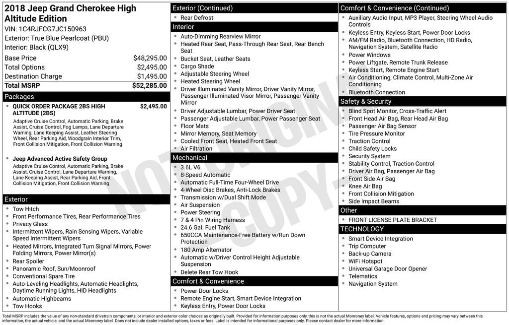 2018 Jeep Grand Cherokee High Altitude True Blue Pearlcoat 4WD 3.6L V6 24V VVT 8-Speed Automatic4WD.Odometer is 6537 miles below market average!Visit www.johnsonautoplaza.com for more information. Feel free to browse our inventory online, request more information about vehicles, set up a test drive or inquire about financing.We look forward to serving you! High Altitude II Package, Jeep Advanced Active Safety Group (Adaptive Cruise Control w/Stop, Advanced Brake Assist, Full Speed FWD Collision Warn Plus, Lane Departure Warning Plus, Parallel & Perp Park Assist w/Stop, and Rain Sensitive Windshield Wipers), Quick Order Package 2BS High Altitude (DISC) (#5 Seat Foam Cushion, Anodized/Light Black Chrome Interior Accents, Black Roof Molding, Black Wood Instrument Panel & Door Spears, Blind Spot & Cross Path Detection, Body Color Door Handles, Body Color Exterior Mirrors, Body Color Fascias w/Granite Accents, Body Color Sill Extension, Bright Pedals, Dark Day Light Opening Moldings, Dark Headlamp Bezel Finish, Dark Lens Taillamps, Dual Dark Chrome Exhaust Tip, Granite Crystal Exterior Accents, Granite Crystal Exterior Badging, Granite Crystal/Black Grille, Headlamp Washer, Leather Wrapped Steering Wheel, Nappa Leather Trimmed Bucket Seats (DISC), Premium Accent Claddings, Premium LED Fog Lamps, and Wheels: 20 x 8.0 Granite Crystal Aluminum (DISC)), Trailer Tow Group IV (DISC) (7 & 4 Pin Wiring Harness, Class IV Receiver Hitch, Heavy-Duty Engine Cooling, and Rear Load Leveling Suspension), 4WD, 10 Speakers, 3.45 Rear Axle Ratio, 4-Wheel Disc Brakes, ABS brakes, Active Noise Control System, Air Conditioning, Alloy wheels, AM/FM radio: SiriusXM, Anti-whiplash front head restraints, Apple CarPlay/Android Auto, Audio memory, Auto High-beam Headlights, Auto-dimming door mirrors, Auto-dimming Rear-View mirror, Auto-leveling suspension, Automatic temperature control, Brake assist, Bumpers: body-color, Compass, Delay-off headlights, Driver door bin, Driver vanity mirror, Dual Bright Exhaust Tips, Dual front impact airbags, Dual front side impact airbags, Electronic Stability Control, Emergency communication system: SiriusXM Guardian, Engine Oil Cooler, Four wheel independent suspension, Front anti-roll bar, Front Bucket Seats, Front Center Armrest w/Storage, Front dual zone A/C, Front fog lights, Front License Plate Bracket, Front reading lights, Fully automatic headlights, Garage door transmitter, Genuine wood dashboard insert, Heated door mirrors, Heated front seats, Heated rear seats, Heated steering wheel, High intensity discharge headlights: Bi-Xenon, Illuminated entry, Knee airbag, Leather Shift Knob, Leather steering wheel, Leather Trim Seats w/Edge Welting, Low tire pressure warning, Memory seat, Navigation System, Normal Duty Suspension, Occupant sensing airbag, Outside temperature display, Overhead airbag, Overhead console, Panic alarm, ParkView Rear Back-Up Camera, Passenger door bin, Passenger vanity mirror, Power door mirrors, Power driver seat, Power Liftgate, Power moonroof, Power passenger seat, Power steering, Power windows, Radio data system, Radio: Uconnect 4C Nav w/8.4 Display, Rain sensing wipers, Rear anti-roll bar, Rear reading lights, Rear seat center armrest, Rear window defroster, Rear window wiper, Remote keyless entry, Roof rack: rails only, Security system, Speed control, Speed-Sensitive Wipers, Split folding rear seat, Spoiler, Steering wheel mounted audio controls, Tachometer, Telescoping steering wheel, Tilt steering wheel, Traction control, Trip computer, Turn signal indicator mirrors, Variably intermittent wipers, Ventilated front seats, and Wheels: 20 x 8.0 Tech Gray AluminuM.Awards:* 2018 KBB.com 10 Most Awarded Brands
