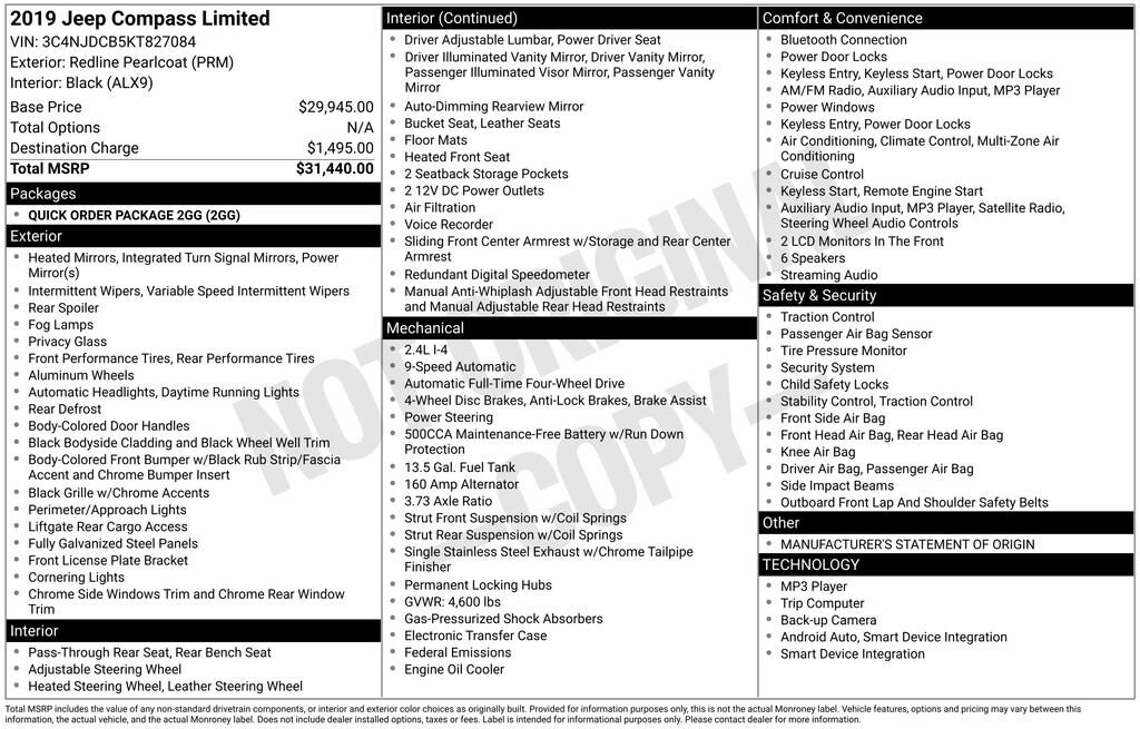 2019 Jeep Compass Limited Redline Pearlcoat 4WD 2.4L I4 9-Speed 948TE Automatic4WD.Odometer is 8844 miles below market average! 22/30 City/Highway MPGVisit www.johnsonautoplaza.com for more information. Feel free to browse our inventory online, request more information about vehicles, set up a test drive or inquire about financing.We look forward to serving you! Quick Order Package 2GG, 4WD, 3.73 Axle Ratio, 4-Wheel Disc Brakes, 6 Speakers, ABS brakes, Air Conditioning, Alloy wheels, AM/FM radio: SiriusXM, Anti-whiplash front head restraints, Apple CarPlay/Android Auto, Auto-dimming Rear-View mirror, Automatic temperature control, Brake assist, Bumpers: body-color, Compass, Delay-off headlights, Driver door bin, Driver vanity mirror, Dual front impact airbags, Dual front side impact airbags, Electronic Stability Control, Four wheel independent suspension, Front anti-roll bar, Front Bucket Seats, Front Center Armrest w/Storage, Front dual zone A/C, Front fog lights, Front reading lights, Fully automatic headlights, Google Android Auto, GPS Antenna Input, Heated door mirrors, Heated front seats, Heated steering wheel, Illuminated entry, Knee airbag, Leather Shift Knob, Leather Trimmed Bucket Seats, Low tire pressure warning, Manufacturer's Statement of Origin, Occupant sensing airbag, Outside temperature display, Overhead airbag, Overhead console, Panic alarm, ParkView Rear Back-Up Camera, Passenger door bin, Passenger vanity mirror, Power door mirrors, Power driver seat, Power steering, Power windows, Radio: Uconnect 4 w/8.4 Display, Rear anti-roll bar, Rear seat center armrest, Rear window defroster, Rear window wiper, Remote keyless entry, Roof rack: rails only, Security system, Speed control, Split folding rear seat, Spoiler, Steering wheel mounted audio controls, Tachometer, Telescoping steering wheel, Tilt steering wheel, Traction control, Trip computer, Turn signal indicator mirrors, USB Host Flip, Variably intermittent wipers, and Wheels: 18 x 7.0 Polished/Gray Pockets AluminuM.