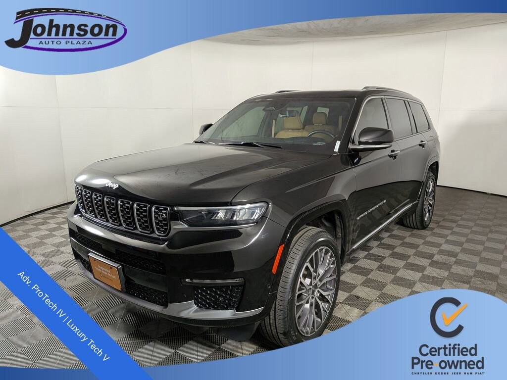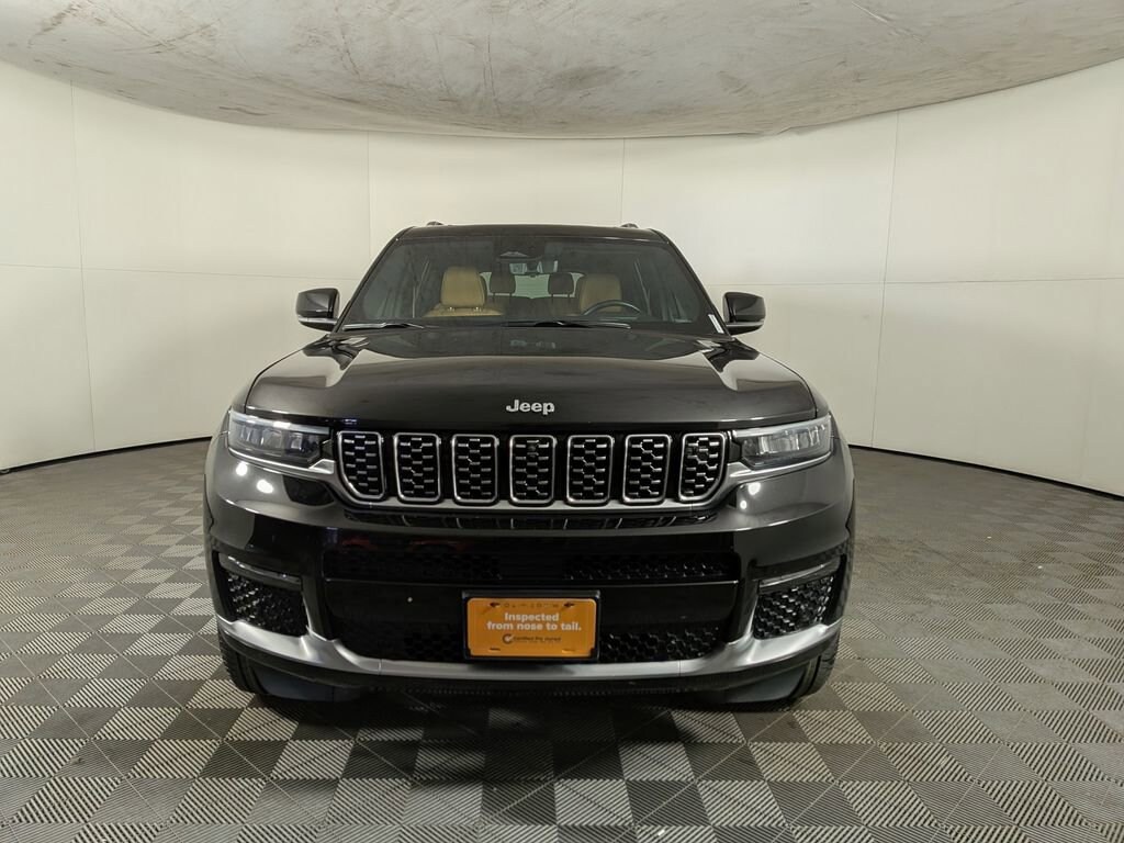 We look forward to serving you! Advanced Protech Group IV (Heads-Up Display, Interior Rear Facing Camera, Night Vision/Pedestrian-Animal Detection, and Rearview Autodim Digital Display Mirror), Luxury Tech Group V (2nd Row Manual Window Shades and Wireless Charging Pad), Quick Order Package 22U Summit Reserve (19 Speakers High Performance Audio, 950 Watt Amplifier, Active Noise Control System, Deluxe Headliner, Palermo Leather Door Trim, Palermo Leather Seats, Summit Reserve, Summit Reserve Badge, Ventilated Rear Seats, and Wheels: 21 x 9.0 Machined Face/Painted Aluminum), Trailer Tow Package (7 & 4 Pin Wiring Harness, Class IV Receiver Hitch, and Trailer Hitch Zoom), Two Tone Paint Group, FCA US LLC Certified Pre-Owned Certified, 10 Speakers, 3.45 Rear Axle Ratio, 3rd row seats: split-bench, 4-Wheel Disc Brakes, ABS brakes, Adaptive suspension, Air Conditioning, Alloy wheels, AM/FM radio: SiriusXM w/360L, Anti-whiplash front head restraints, Apple CarPlay/Android Auto, Audio memory, Auto High-beam Headlights, Auto-dimming door mirrors, Auto-dimming Rear-View mirror, Auto-leveling suspension, Automatic temperature control, Body Color Roof (DISC), Brake assist, Bumpers: body-color, Compass, Delay-off headlights, Driver door bin, Driver vanity mirror, Dual front impact airbags, Dual front side impact airbags, Electronic Stability Control, Emergency communication system, Four wheel independent suspension, Front anti-roll bar, Front Bucket Seats, Front Center Armrest w/Storage, Front dual zone A/C, Front fog lights, Front License Plate Bracket (DISC), Front reading lights, Fully automatic headlights, Garage door transmitter, Genuine wood dashboard insert, Genuine wood door panel insert, Heated door mirrors, Heated front seats, Heated rear seats, Heated steering wheel, Illuminated entry, Knee airbag, Leather steering wheel, Low tire pressure warning, Memory seat, Nappa Leather Seats, Navigation System, Normal Duty Suspension, Occupant sensing airbag, Outside temperature display, Overhead airbag, Overhead console, Panic alarm, Passenger door bin, Passenger vanity mirror, Power door mirrors, Power driver seat, Power Fold Seatbacks, Power Liftgate, Power moonroof: CommandView, Power passenger seat, Power steering, Power windows, Radio data system, Radio: Uconnect 5 Nav w/10.1 Display, Rain sensing wipers, Rear air conditioning, Rear anti-roll bar, Rear dual zone A/C, Rear reading lights, Rear seat center armrest, Rear window defroster, Rear window wiper, Reclining 3rd row seat, Remote keyless entry, Roof rack: rails only, Security system, Speed control, Speed-Sensitive Wipers, Split folding rear seat, Spoiler, Steering wheel memory, Steering wheel mounted audio controls, Tachometer, Telescoping steering wheel, Tilt steering wheel, Traction control, Trip computer, Turn signal indicator mirrors, Variably intermittent wipers, Ventilated front seats, Voltmeter, and Wheels: 20 x 8.5 Fully Polished Aluminu