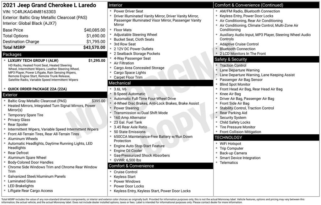 We look forward to serving you! Luxury Tech Group I (115V Auxiliary Power Outlet, 3rd Row Charge-Only USB Ports, For More Info, Call 800-643-2112, Heated Front Seats, Heated Steering Wheel, Leather Wrapped Steering Wheel, Power Liftgate, Rain Sensitive Windshield Wipers, Remote Start System, Selectable Tire Fill Alert, SiriusXM Radio Service, SiriusXM Satellite Radio, and Wireless Charging Pad), Quick Order Package 22A, 3.45 Rear Axle Ratio, 3rd row seats: split-bench, 4-Wheel Disc Brakes, 6 Speakers, ABS brakes, Air Conditioning, Alloy wheels, AM/FM radio, Anti-whiplash front head restraints, Apple CarPlay/Android Auto, Automatic temperature control, Brake assist, Bumpers: body-color, Cloth Seats, Compass, Delay-off headlights, Driver door bin, Driver vanity mirror, Dual front impact airbags, Dual front side impact airbags, Electronic Stability Control, Emergency communication system, Four wheel independent suspension, Front anti-roll bar, Front Bucket Seats, Front Center Armrest w/Storage, Front dual zone A/C, Front reading lights, Fully automatic headlights, Heated door mirrors, Illuminated entry, Knee airbag, Low tire pressure warning, Manual Fold Seatbacks, Normal Duty Suspension, Occupant sensing airbag, Outside temperature display, Overhead airbag, Overhead console, Panic alarm, ParkView Rear Back-Up Camera, Passenger door bin, Passenger vanity mirror, Power door mirrors, Power driver seat, Power steering, Power windows, Radio data system, Radio: Uconnect 5 w/8.4 Display, Rear air conditioning, Rear anti-roll bar, Rear reading lights, Rear window defroster, Rear window wiper, Reclining 3rd row seat, Remote keyless entry, Roof rack: rails only, Security system, Speed control, Speed-Sensitive Wipers, Split folding rear seat, Spoiler, Steering wheel mounted audio controls, Tachometer, Telescoping steering wheel, Tilt steering wheel, Traction control, Trip computer, Turn signal indicator mirrors, Variably intermittent wipers, and Wheels: 18 x 8.0 Fully Painted AluminuM.