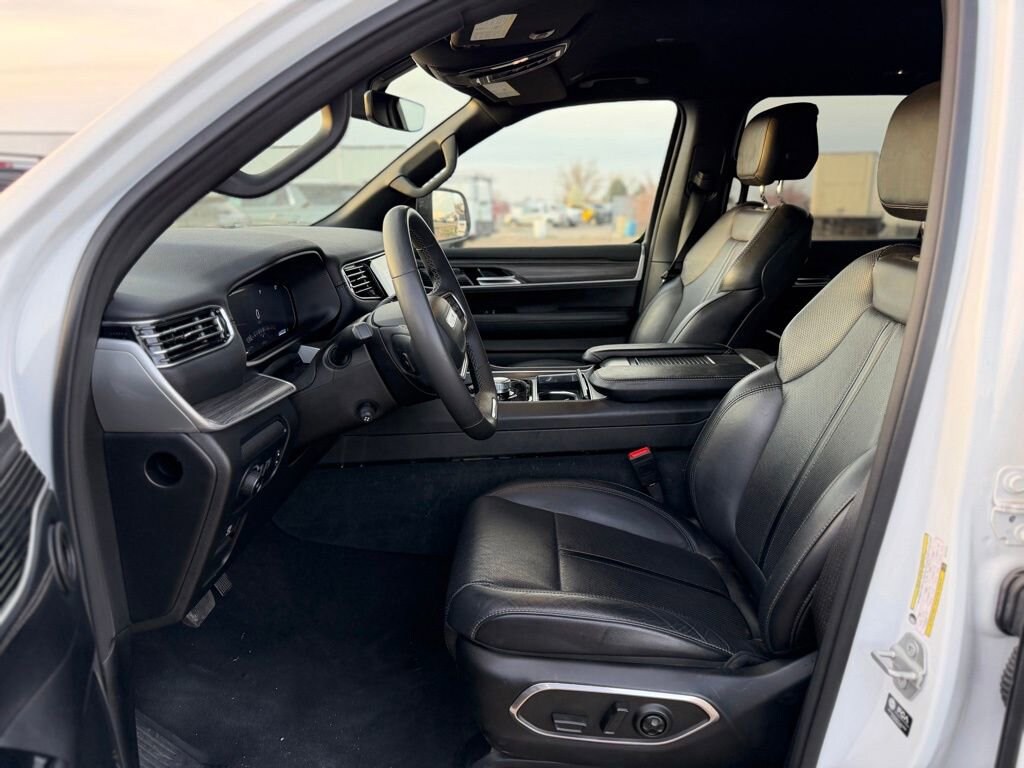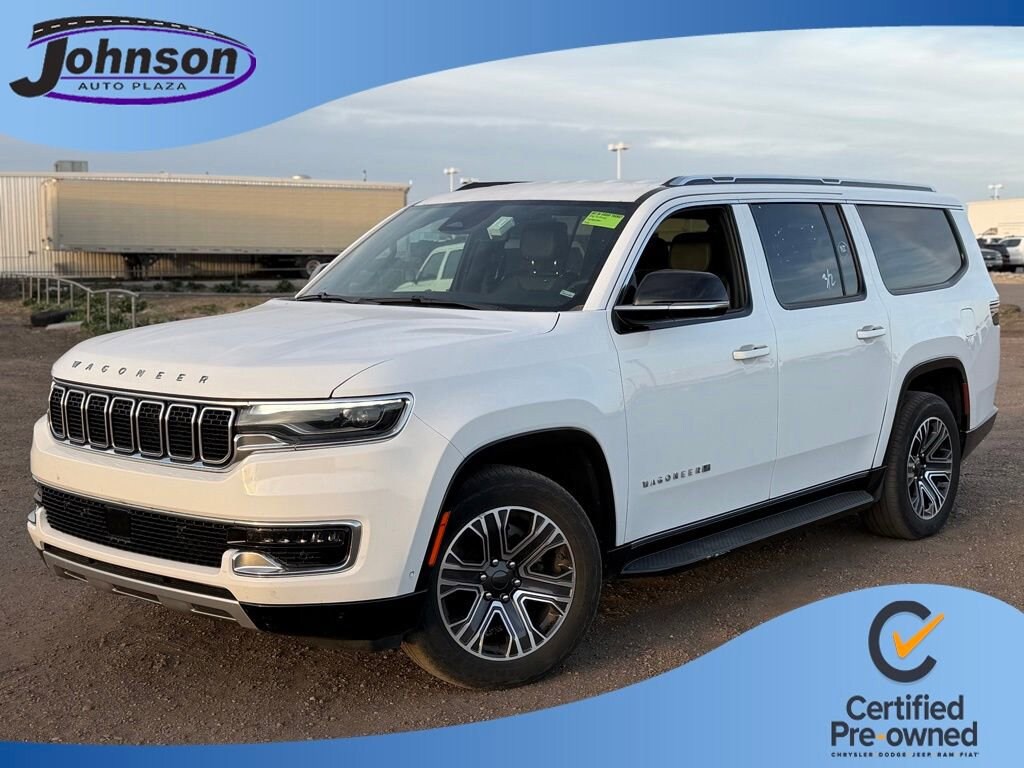 We look forward to serving you! FCA US LLC Certified Pre-Owned Certified, 10 Speakers, 3.55 Rear Axle Ratio, 3rd row seats: bench, 4-Wheel Disc Brakes, ABS brakes, Adjustable pedals, Air Conditioning, Alloy wheels, AM/FM radio: SiriusXM with 360L, Anti-whiplash front head restraints, Apple CarPlay/Android Auto, Audio memory, Auto-dimming door mirrors, Auto-dimming Rear-View mirror, Auto-leveling suspension, Automatic temperature control, Brake assist, Bumpers: body-color, Compass, Delay-off headlights, Driver door bin, Driver vanity mirror, Driver's Seat Mounted Armrest, Dual front impact airbags, Dual front side impact airbags, Electronic Stability Control, Emergency communication system: Wagoneer Connect, Exterior Parking Camera Rear, Four wheel independent suspension, Front anti-roll bar, Front Bucket Seats, Front Center Armrest w/Storage, Front dual zone A/C, Front fog lights, Front reading lights, Full Length Floor Console, Fully automatic headlights, Garage door transmitter, Genuine wood console insert, Genuine wood dashboard insert, Genuine wood door panel insert, Heated door mirrors, Heated front seats, Heated steering wheel, Illuminated entry, Knee airbag, Leather Trimmed Bucket Seats, Low tire pressure warning, Memory seat, Navigation System, Normal Duty Suspension, Occupant sensing airbag, Outside temperature display, Overhead airbag, Overhead console, Panic alarm, Passenger door bin, Passenger seat mounted armrest, Passenger vanity mirror, Pedal memory, Power adjustable front head restraints, Power door mirrors, Power driver seat, Power Liftgate, Power passenger seat, Power steering, Power windows, Radio data system, Radio: Uconnect 5 Nav w/10.1 Display, Rain sensing wipers, Rear air conditioning, Rear anti-roll bar, Rear reading lights, Rear seat center armrest, Rear window defroster, Rear window wiper, Reclining 3rd row seat, Remote keyless entry, Security system, Speed control, Speed-sensing steering, Speed-Sensitive Wipers, Split folding rear seat, Steering wheel memory, Steering wheel mounted audio controls, Tachometer, Telescoping steering wheel, Tilt steering wheel, Traction control, Trip computer, Turn signal indicator mirrors, Variably intermittent wipers, Ventilated front seats, Voltmeter, and Wheels: 20 x 9.0 Premium 2 AluminuM.
