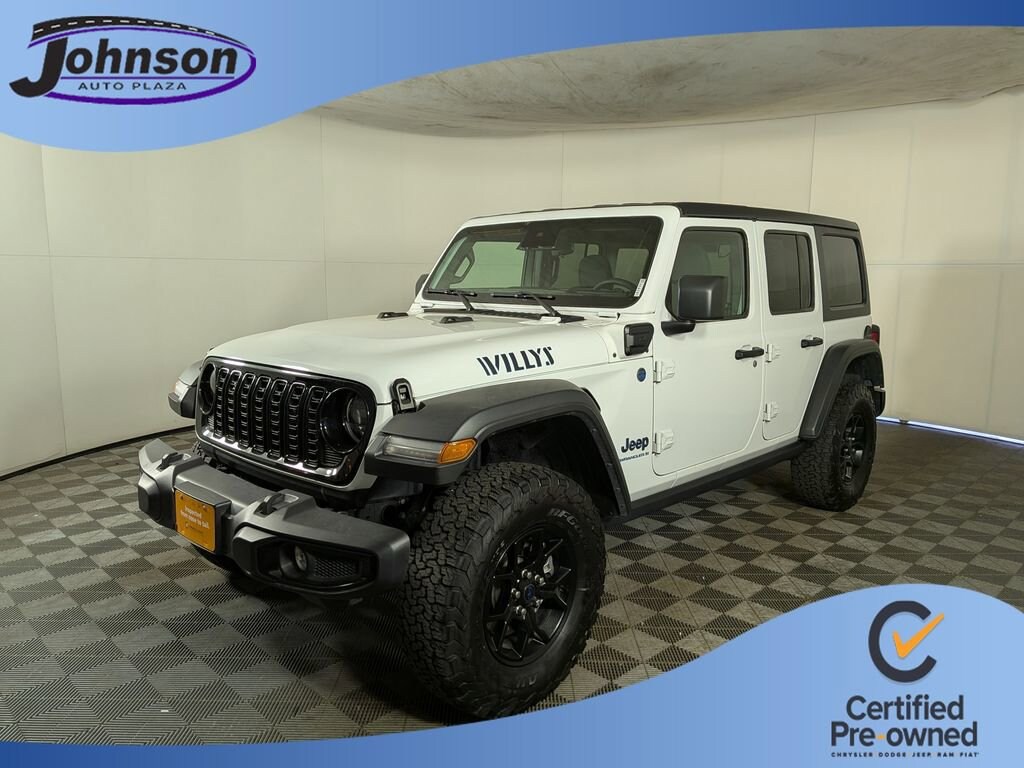We look forward to serving you! Convenience Group (2-Door Passive Entry, Front Door Locks, Air Conditioning w/Auto Temperature Control, Air Filtering, Emergency/Assistance Call, Heated Front Seats, Heated Steering Wheel, Remote Start System, and Universal Garage Door Opener), Quick Order Package 29W Willys 4xe (4-Wheel Drive Swing Gate Decal, 4.10 Rear Axle Ratio, 7 & 4 Pin Wiring Harness, 97 MPH Vehicle Max Speed Calibration, Auxiliary Switches, Black Grille, Class II Receiver Hitch, Conventional Differential Front Axle, E-Locker Rear Axle, Front LED Fog Lamps, LED Premium Reflector Headlamps, Molded in Color Rubicon Highline Flare, MOPAR All-Weather Floor Mats, Off-Road Plus Mode, Wheels: 17 x 7.5 Painted Black, Willy's Suspension, and Willys 4xe Hood Decal), FCA US LLC Certified Pre-Owned Certified, 2.0L I4 DOHC, 3.73 Rear Axle Ratio, 4-Wheel Disc Brakes, 8 Speakers, ABS brakes, Air Conditioning, Alloy wheels, AM/FM radio: SiriusXM, Apple CarPlay/Android Auto, Black 3-Piece Hard Top, Brake assist, Cloth Low-Back Bucket Seats, Compass, Delay-off headlights, Driver door bin, Driver vanity mirror, Dual front impact airbags, Dual front side impact airbags, Electronic Stability Control, Freedom Panel Storage Bag, Front anti-roll bar, Front Bucket Seats, Front Center Armrest w/Storage, Front fog lights, Front License Plate Bracket (DISC), Front reading lights, Fully automatic headlights, Heated door mirrors, Illuminated entry, Integrated roll-over protection, Low tire pressure warning, Occupant sensing airbag, Outside temperature display, Overhead airbag, Panic alarm, ParkView Rear Back-Up Camera, Passenger door bin, Passenger vanity mirror, Power door mirrors, Power steering, Power windows, Radio data system, Radio: Uconnect 5 w/12.3 Display, Rear anti-roll bar, Rear reading lights, Rear Window Defroster, Rear Window Wiper/Washer, Remote keyless entry, Security system, Speed control, Split folding rear seat, Sport Suspension, Steering wheel mounted audio controls, Tachometer, Telescoping steering wheel, Tilt steering wheel, Traction control, Trip computer, Variably intermittent wipers, Voltmeter, and Wheels: 20 x 8 Machined/Painted GraY.