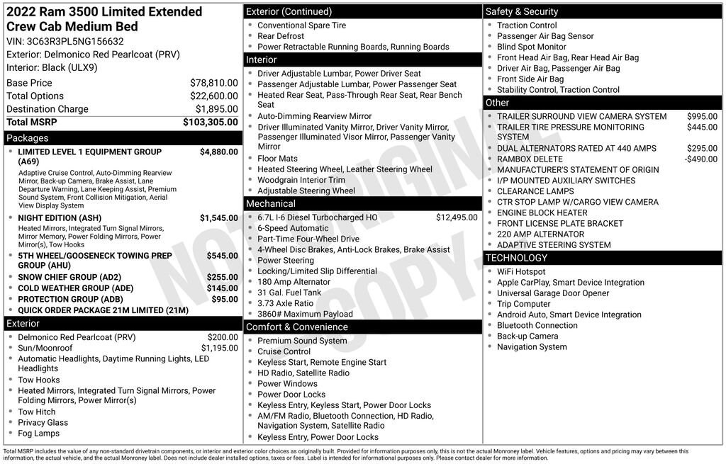 We look forward to serving you! 5th Wheel/Gooseneck Towing Prep Group (Pickup Box, Vendor Painted Cargo Box, and Vendor Painted Cargo Box Tracking), Cold Weather Group (Engine Block Heater and MOPAR Winter Front Grille Cover), Limited Level 1 Equipment Group (17 Speaker harman kardon Premium Sound, Adaptive Cruise Control w/Stop, Adaptive Steering System, CTR Stop Lamp w/Cargo View Camera, Digital Rearview Mirror, Full Speed Forward Collision Warning Plus, Lane Keep Assist, Surround View Camera System, and Trailer Reverse Guidance), Night Edition (Black Exterior Mirrors, Black Exterior Truck Badging, Black Grille Limited, Black Headlamp Bezels, Black Ram Head Tailgate Badge, Black Tail Lamp Bezels, Black Wheel Center Hub, Body Color Door Handles, Body Color Grille Surround, Exterior Mirrors Courtesy Lamps, Exterior Mirrors w/Heating Element, Exterior Mirrors w/Memory, Exterior Mirrors w/Supplemental Signals, Mirror Running Lights, Mirror-Mounted Aux Reverse Lamps, Painted Front Bumper, Painted Rear Bumper, Power Adjustable Convex Aux Mirrors, Power Black Tow Mirrors w/Convex Spotter & Memory, Power-Folding Mirrors, Tow Hooks, and Trailer Tow Mirrors), Protection Group, Quick Order Package 21M Limited, Snow Chief Group (Clearance Lamps, Dash Pass Thru Wire Circuits, and I/P Mounted Auxiliary Switches), FCA US LLC Certified Pre-Owned Certified, 10 Speakers, 12 Touchscreen Display, 220 Amp Alternator, 3.73 Axle Ratio, 4-Wheel Disc Brakes, 4G LTE Wi-Fi Hot Spot, ABS brakes, Active Noise Control System, Adjustable pedals, Air Conditioning, Alloy wheels, AM/FM radio: SiriusXM with 360L, Apple CarPlay, Apple CarPlay/Android Auto, Audio memory, Auto High-beam Headlights, Auto-dimming Rear-View mirror, Automatic temperature control, Bodyside moldings, Brake assist, Bumpers: chrome, Center Hub, Compass, Connected Travel & Traffic Services, Connectivity - US/Canada, Delay-off headlights, Disassociated Touchscreen Display, Driver door bin, Driver vanity mirror, Dual Alternators Rated At 440 Amps, Dual front impact airbags, Dual front side impact airbags, Electronic Stability Control, Electronically Controlled Throttle, Front anti-roll bar, Front Bucket Seats, Front Center Armrest w/Storage, Front dual zone A/C, Front fog lights, Front License Plate Bracket, Front reading lights, Fully automatic headlights, Garage door transmitter, Genuine wood console insert, Genuine wood dashboard insert, Genuine wood door panel insert, Global Telematics Box Module (TBM), Google Android Auto, GPS Antenna Input, GPS Navigation, HD Radio, Heated door mirrors, Heated front seats, Heated rear seats, Heated steering wheel, Illuminated entry, Integrated Voice Command w/Bluetooth, Leather steering wheel, Limited Leather Bucket Seats, Low tire pressure warning, Manufacturer's Statement of Origin, Memory seat, Navigation System, Occupant sensing airbag, Off-Road Information Pages, Outside temperature display, Overhead airbag, Overhead console, Panic