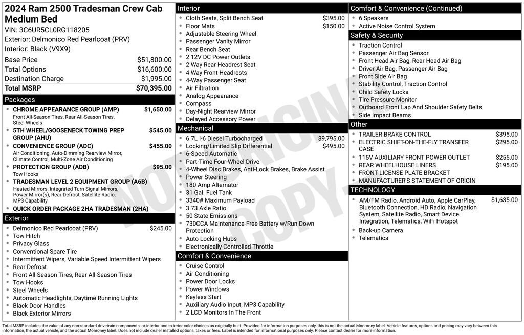 2024 Ram 2500 Tradesman Delmonico Red Pearlcoat 4WD Cummins 6.7L I6 Turbodiesel 6-Speed AutomaticCertified. FCA US LLC Certified Pre-Owned Details:* Transferable Warranty* Vehicles Up to 75,000 Miles and/or 5 Model Years. 24-Hour Towing & Roadside Assistance, Car Rental Allowance, CARFAX® Vehicle History ReportTM and an Introductory 3-month Subscription to SiriusXM® Satellite Radio & Certified Warranty Upgrades* Roadside Assistance* Vehicle History* 125 Point Inspection* Limited Warranty: 3 Month/3,000 Mile (whichever comes first) after new car warranty expires or from certified purchase date* Warranty Deductible: $100* Powertrain Limited Warranty: 84 Month/100,000 Mile (whichever comes first) from original in-service dateVisit www.johnsonautoplaza.com for more information. Feel free to browse our inventory online, request more information about vehicles, set up a test drive or inquire about financing.We look forward to serving you! Chrome Appearance Group (Bright Front Bumper, Bright Rear Bumper, Center Hub, Chrome Grille Surround, Chrome Headlamp Bezels, Matte Black Mesh Grille w/Chrome, and Wheels: 18 x 8.0 Steel Chrome Clad), Convenience Group (Air Conditioning ATC w/Dual Zone Control, Auto-Dimming Rear-View Mirror, and Tinted Acoustic Windshield Glass), Protection Group (Tow Hooks), Quick Order Package 2HA Tradesman, Tradesman Level 2 Equipment Group (2 Way Rear Headrest Seat, 4 Way Front Headrests, 40/20/40 Split Bench Seat, Black Exterior Mirrors, Cloth 40/20/40 Bench Seat, Exterior Mirrors Courtesy Lamps, Exterior Mirrors w/Heating Element, Exterior Mirrors w/Supplemental Signals, For More Info, Call 800-643-2112, Front Armrest w/Cupholders, Manual Adjust 4-Way Driver Seat, Manual Adjust 4-Way Front Passenger Seat, Manual Folding Exterior Mirrors, Manual Telescoping Mirrors, Mirror Running Lights, Power Adjust Mirrors, Power Adjustable Convex Aux Mirrors, Power Heated Folding Telescope Mirrors, Rear Folding Seat, Rear Power Sliding Window, Rear Window Defroster, Remote USB Port - Charge Only, SiriusXM Radio Service, SiriusXM Satellite Radio, and Storage Tray), FCA US LLC Certified Pre-Owned Certified, 115V Auxiliary Front Power Outlet, 17 x 7.5 Steel Styled Wheels, 3.73 Axle Ratio, 4-Wheel Disc Brakes, 400W Inverter, 4G LTE Wi-Fi Hot Spot, 5th Wheel/Gooseneck Towing Prep Group, 6 Speakers, 8.4 Touchscreen Display, ABS brakes, Active Noise Control System, Air Conditioning, Alexa Built-In, All R1 High Radios, All Radio Equipped Vehicles, AM/FM radio, Anti-Spin Differential Rear Axle, Apple CarPlay, Brake assist, Carpet Floor Covering, Compass, Connected Travel & Traffic Services, Connectivity - US/Canada, Delay-off headlights, Disassociated Touchscreen Display, Driver door bin, Dual front impact airbags, Dual front side impact airbags, Electric Shift-On-The-Fly Transfer Case, Electronic Stability Control, Electronically Controlled Throttle, Emergency communication system: SiriusXM Guardian, Exterior 115V AC Outlet, For Details, Visit DriveUconnect.com, Front & Rear Floor Mats, Front anti-roll bar, Front Center Armrest w/Storage, Front License Plate Bracket, Front reading lights, Fully automatic headlights, Global Telematics Box Module (TBM), Google Android Auto, GPS Antenna Input, GPS Navigation, HD Radio, Heavy Duty Vinyl 40/20/40 Split Bench Seat, Illuminated entry, Integrated Center Stack Radio, Integrated Voice Command w/Bluetooth, Low tire pressure warning, Manufacturer's Statement of Origin, Occupant sensing airbag, Off-Road Information Pages, Outside temperature display, Overhead airbag, Overhead console, ParkView Rear Back-Up Camera, Passenger door bin, Passenger vanity mirror, Power steering, Power windows, Radio data system, Radio: Uconnect 3 w/5 Display, Radio: Uconnect 5 Nav w/8.4 Display, Rear anti-roll bar, Rear step bumper, Rear Wheelhouse Liners, Selectable Tire Fill Alert, SiriusXM w/360L, Speed control, Tachomet