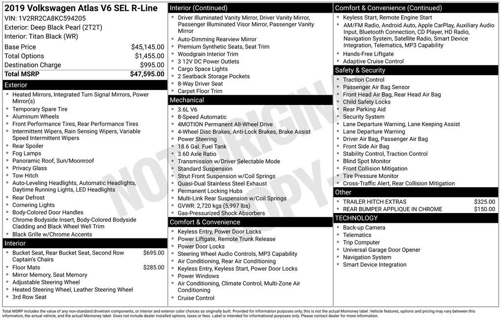 2019 Volkswagen Atlas 3.6L V6 SEL R-Line R-Line Deep Black AWD 3.6L VR6 8-Speed Automatic with TiptronicVisit www.johnsonautoplaza.com for more information. Feel free to browse our inventory online, request more information about vehicles, set up a test drive or inquire about financing.We look forward to serving you! 20 Twin 5-Spoke Alloy Wheels, 2nd-Row Dual Captain's Chairs, 3.60 Axle Ratio, 3rd row seats: split-bench, 4-Wheel Disc Brakes, 8 Speakers, ABS brakes, Active Blind Spot Monitor, Air Conditioning, Alloy wheels, AM/FM radio: SiriusXM, Auto-dimming Rear-View mirror, Automatic temperature control, Brake assist, Bumpers: body-color, Compass, Delay-off headlights, Driver door bin, Driver vanity mirror, Dual front impact airbags, Dual front side impact airbags, Electronic Stability Control, Emergency communication system: VW Car-Net services (capabilities require enrollment or subscription), Exterior Parking Camera Rear, Forward collision: FCW w/Autonomous Emergency Braking mitigation, Four wheel independent suspension, Front anti-roll bar, Front Bucket Seats, Front Center Armrest, Front dual zone A/C, Front fog lights, Front reading lights, Garage door transmitter: HomeLink, Heated Comfort Front Bucket Seats, Heated door mirrors, Heated front seats, Heated steering wheel, Heavy Duty Trunk Liner w/VW CarGo Blocks, Illuminated entry, Low tire pressure warning, Memory seat, Navigation System, Occupant sensing airbag, Outside temperature display, Overhead airbag, Overhead console, Panic alarm, Passenger door bin, Passenger vanity mirror, Power door mirrors, Power driver seat, Power Liftgate, Power moonroof, Power passenger seat, Power steering, Power windows, Radio data system, Radio: Discover Media 8.0 Touchscreen w/Nav, Rain sensing wipers, Rear air conditioning, Rear anti-roll bar, Rear Bumper Applique in Chrome, Rear reading lights, Rear seat center armrest, Rear window defroster, Rear window wiper, Remote CD player, Remote keyless entry, Roof rack: rails only, Rubber Mats Kit - Captain's Chairs, Security system, Speed control, Speed-sensing steering, Split folding rear seat, Spoiler, Standard Suspension, Steering wheel mounted audio controls, Tachometer, Telescoping steering wheel, Tilt steering wheel, Traction control, Trailer Hitch Extras (DISC), Trip computer, Turn signal indicator mirrors, V-Tex Leatherette Seating Surfaces, and Variably intermittent wiperS.Awards:* 2019 KBB.com 10 Best Road Trip Cars * 2019 KBB.com 12 Best Family Cars